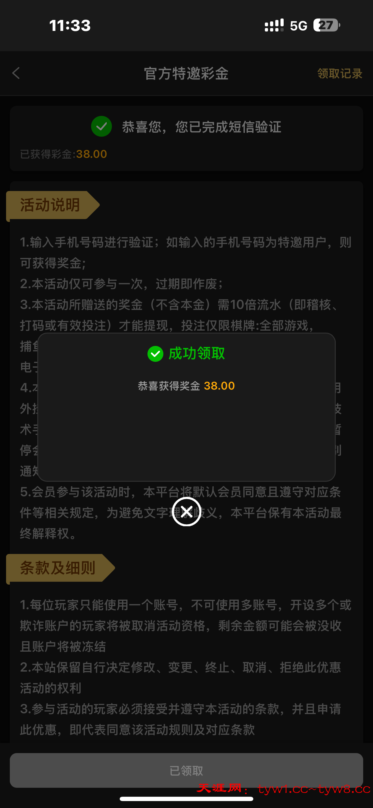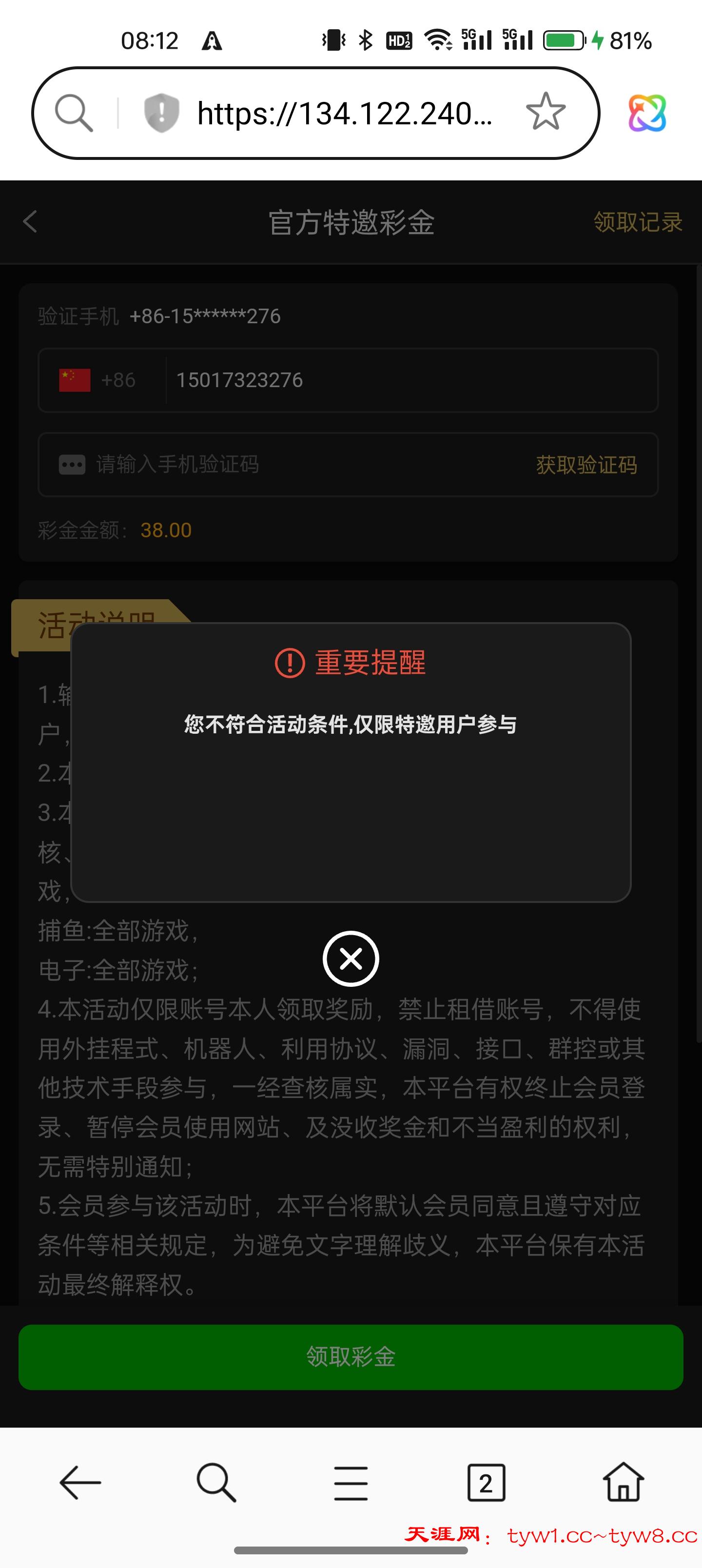 我先验证了 不符合。然后充值了10送了2 抢红包给了4任务里面完成首存送8 提现100后 再去尝试特邀 结果成功领取 38 不知道是充值的原因还是提现成功的原因让我不符合变成了符合