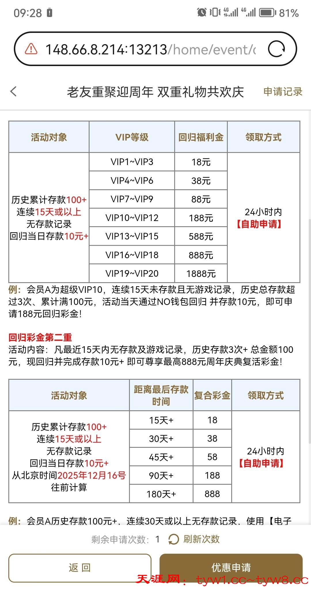链接hg0666.com 历史充值满三次满100可申请。我v1号充值10领了两个回归礼18和58的,符合的兄弟自己参加。
