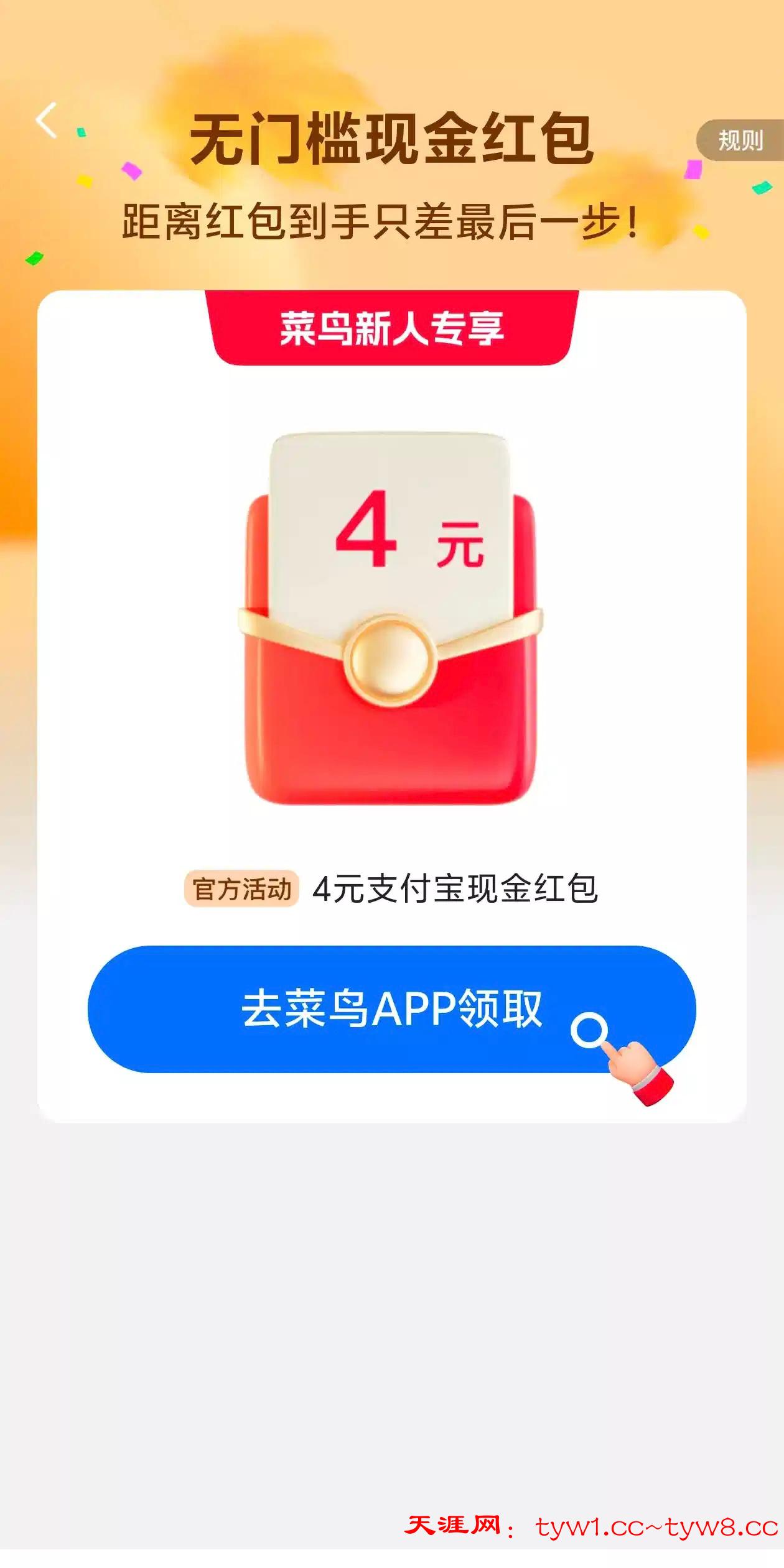 支付宝搜索菜鸟,点那个4块钱,下载菜鸟登录一下,必得4块钱支付宝红包,多号多撸,三个支付宝就是12,点那个菜鸟好礼4元点那个任务现金