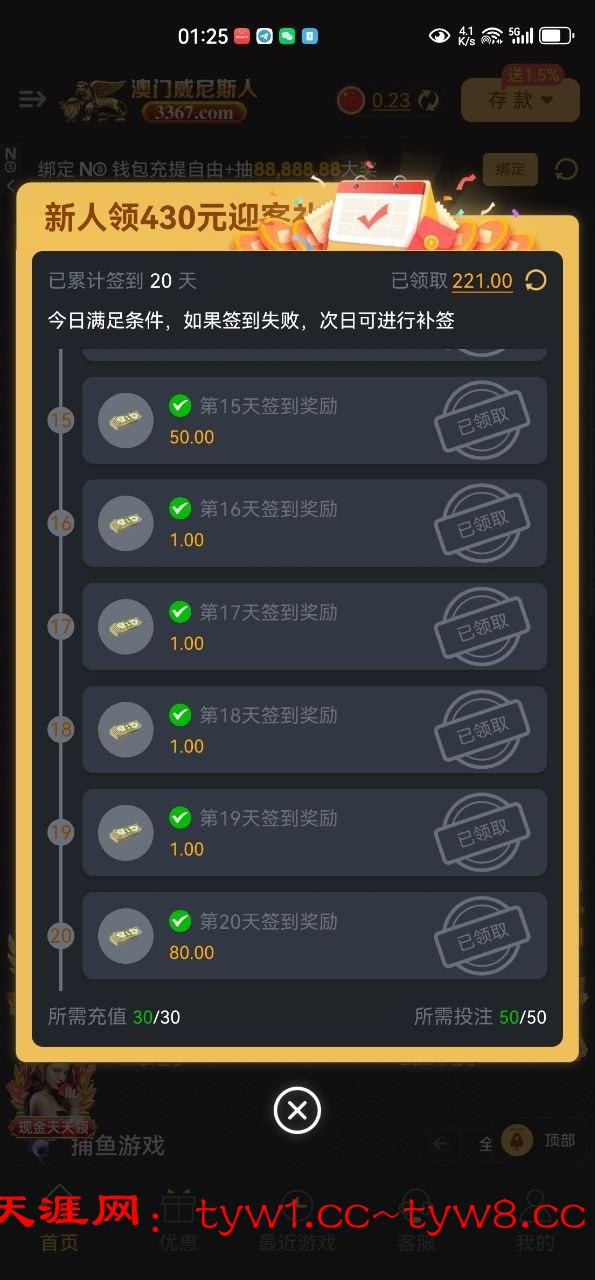 签到30天送430 签到条件是充值30+50打码
