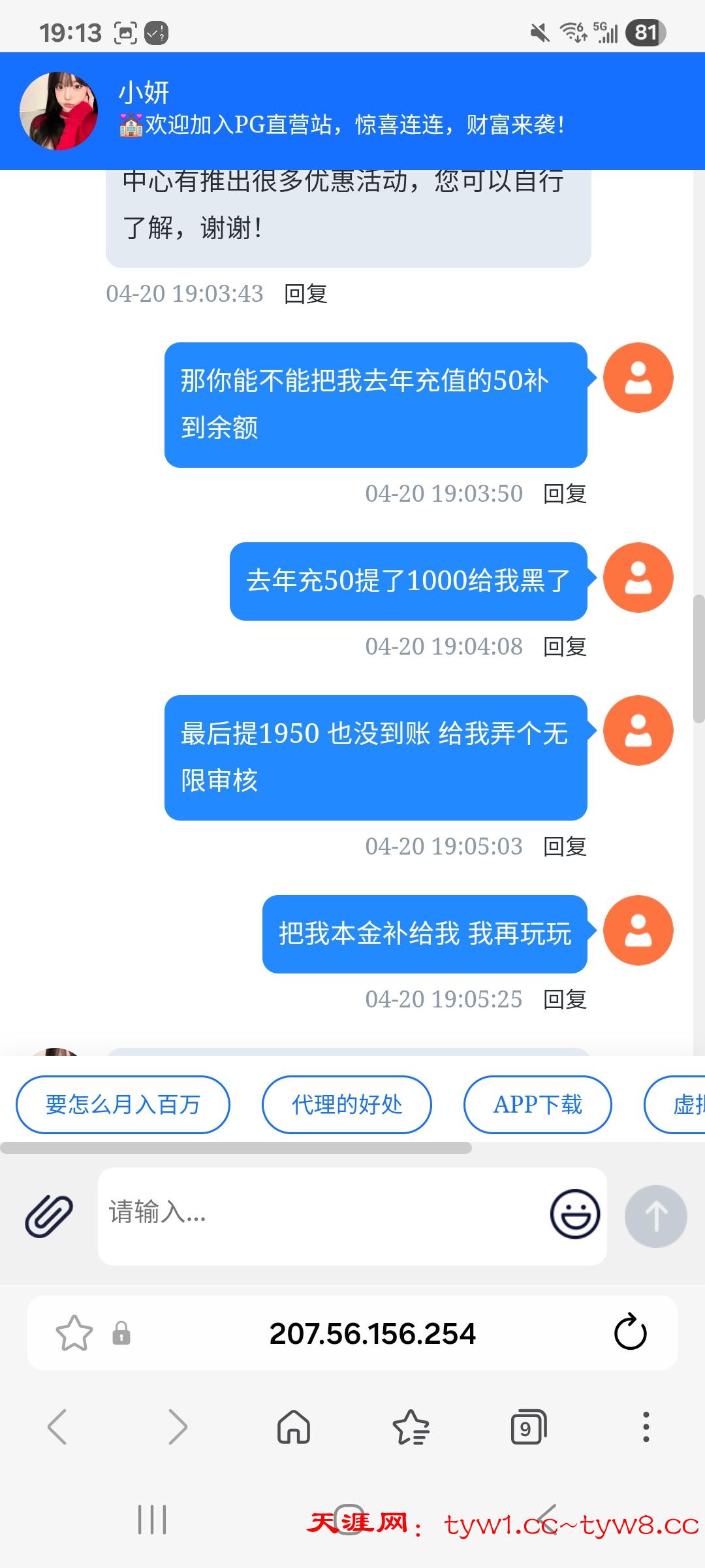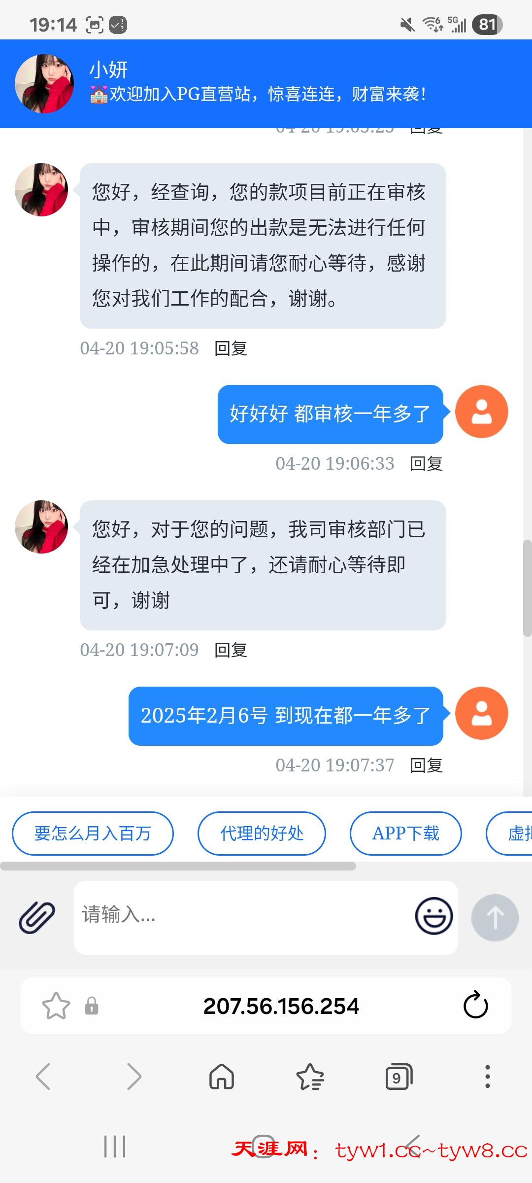 今天看322送彩金我去碰了一下 没碰到。然后顺便问了一下我在2025年2月6号提现的1950元咋样了 ,客服说还在审核。这种又当又立的台子真恶心,他让你提现但是他无限期审核,硬要说的话 他还真没黑我,只是还在提现审核阶段。现在玩这个台子的还是要注意一下,别他这老毛病又犯了
