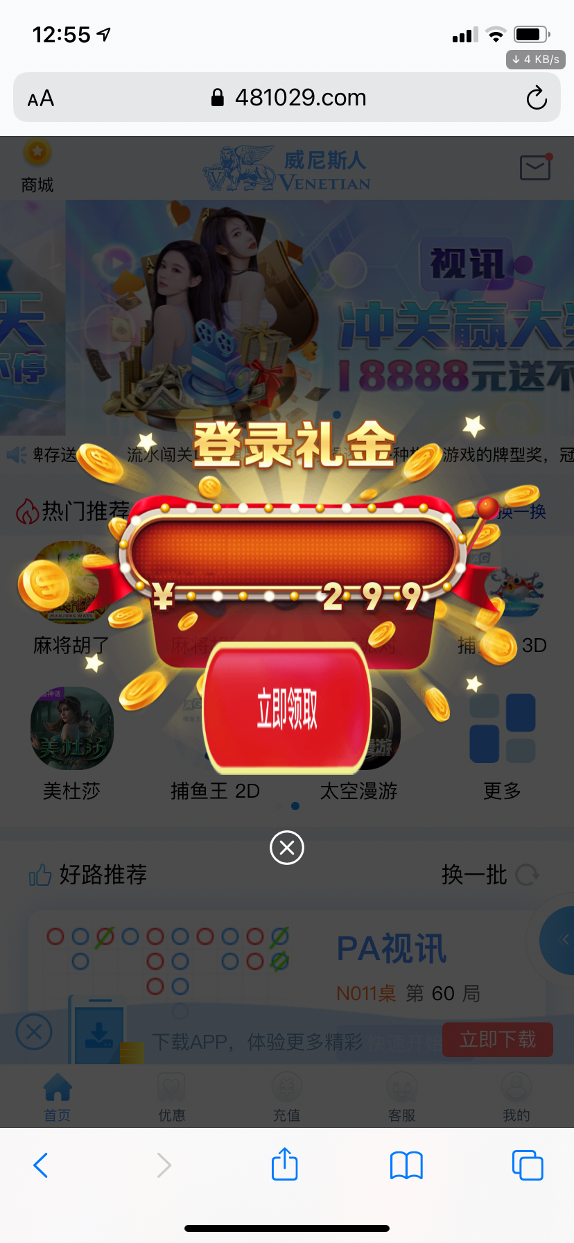 直接登录弹出,还有上咖聊找客服领88,都可以试试,这台没两个月回馈一次,两年没充值了
